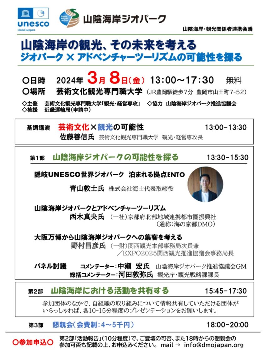そこで、①観光関係者・団体の横の連携、産学官の連携を深めること、②山陰海岸の「ジオパーク×アドベンチャーツーリズム」の可能性を探ること、を目的に「山陰海岸・観光関係者連携会議」を開催することにいたします。