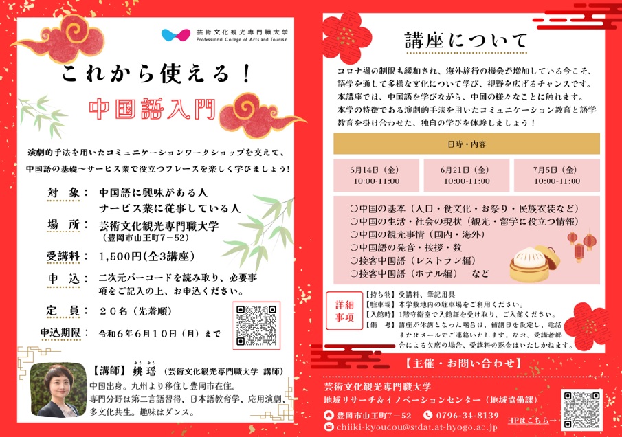 | 受講対象 | 中国語に興味がある人 サービス業に従事している人 |