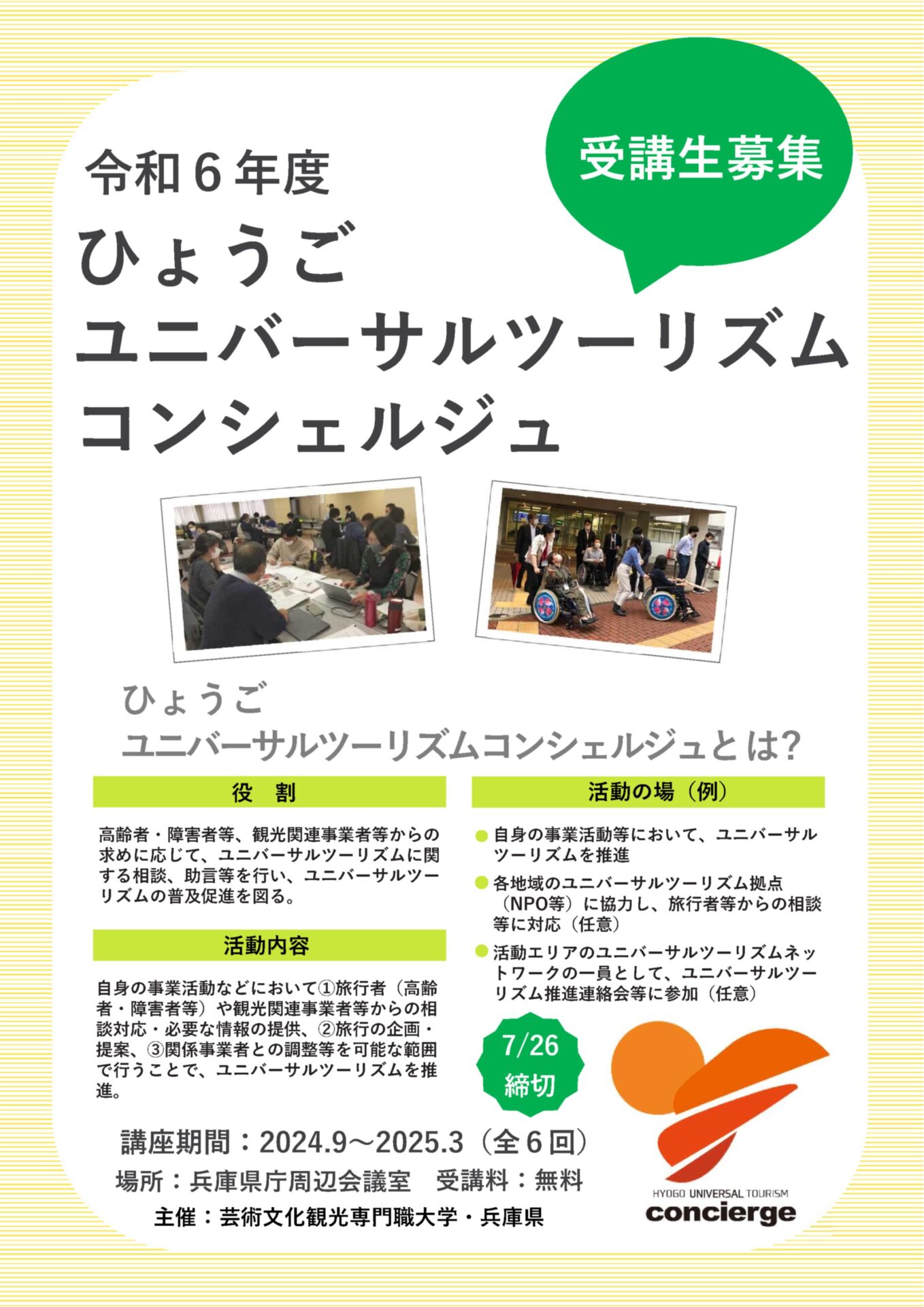 旅行者や観光事業者からの相談に対応するなど、ユニバーサルツーリズムの普及促進を図る人材(コンシェルジュ)を育成する「ひょうごユニバーサルツーリズムコンシェルジュ育成プログラム」の受講生を下記のとおり募集します。
