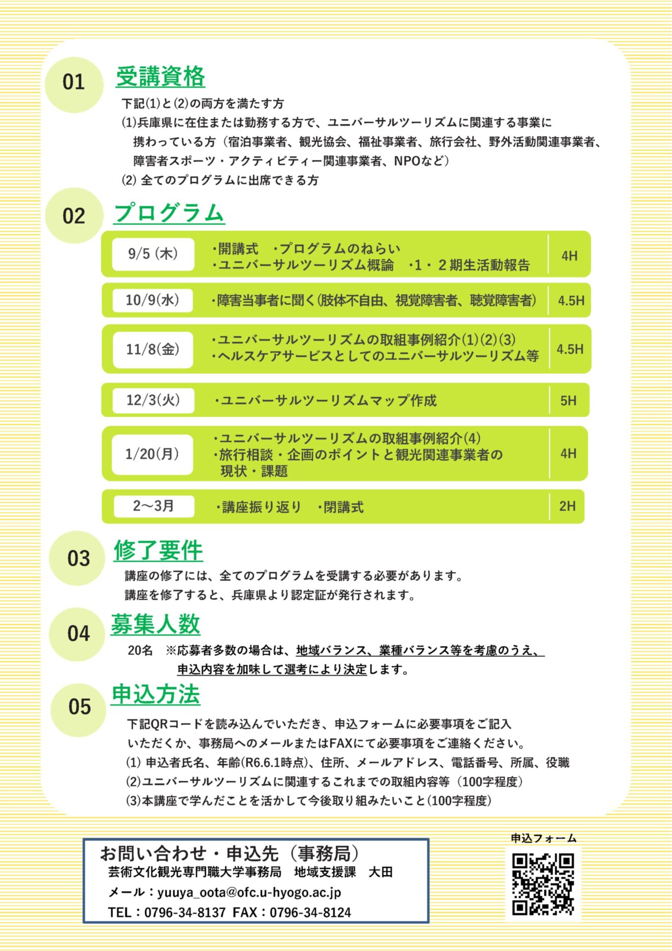 | 申込方法 | 下記リンクより必要事項をフォームに入れ申込してください。 必要事項:申込者氏名、年齢(R6.6.1 時点)、住所、メールアドレス、電話番号、所属または勤務先、役職、ユニバーサルツーリズムに関連するこれまでの取組内容等(100 字程度)、本講座で学んだことを活かして今後取り組みたいこと(100 字程度) 事務局へメールまたはFAXにて |
